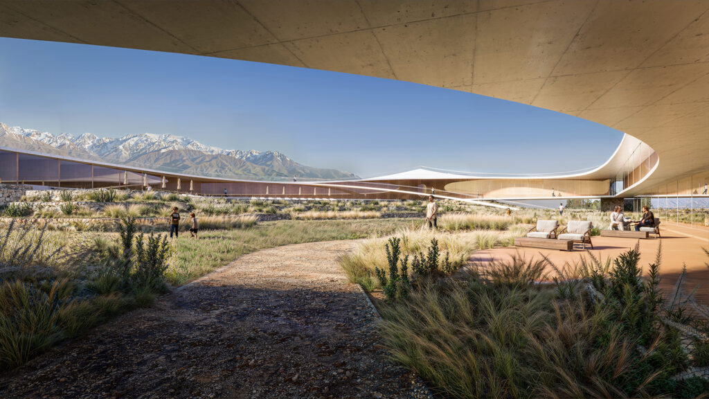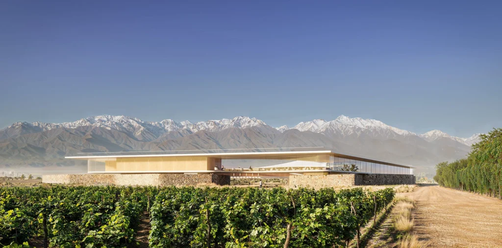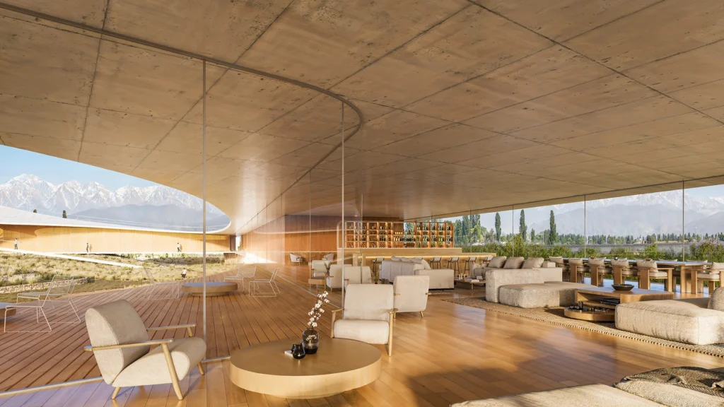 Desde el punto de vista arquitectónico, el proyecto propone una estética contemporánea basada en curvas suaves, grandes superficies vidriadas y materiales nobles, en un diálogo constante con el paisaje. La planta baja se organiza en torno a un claustro central con vegetación autóctona que funciona como corazón verde del complejo, desde donde se distribuyen las áreas comunes: lobby, restaurante con cava, spa y espacios de contemplación, todos con conexión directa al viñedo y a la montaña.