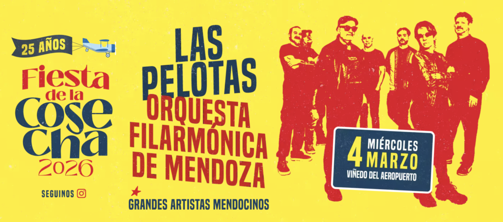 El tándem musical será de alto impacto popular, pues Las Pelotas será la banda que subirá al escenario del aeropuerto para ofrecer sus hits en versión sinfónica junto a la Orquesta Filarmónica de Mendoza y sus más de 70 músicos en escena. El prestigioso maestro Gustavo “Popi” Spatocco será el encargado de la dirección musical y la composición de los arreglos sinfónicos originales para este concierto, además estrenará junto a la Filarmónica de Mendoza una obra que recorre los momentos memorables de los 25 años de la Fiesta y trae nuevamente al escenario las voces de los artistas que hicieron vibrar este escenario montado sobre el viñedo. Con cuecas y gatos llegará el momento de la cosecha y será Nico Diez quien dirigirá el ensamble de voces e instrumentos cuyanos.